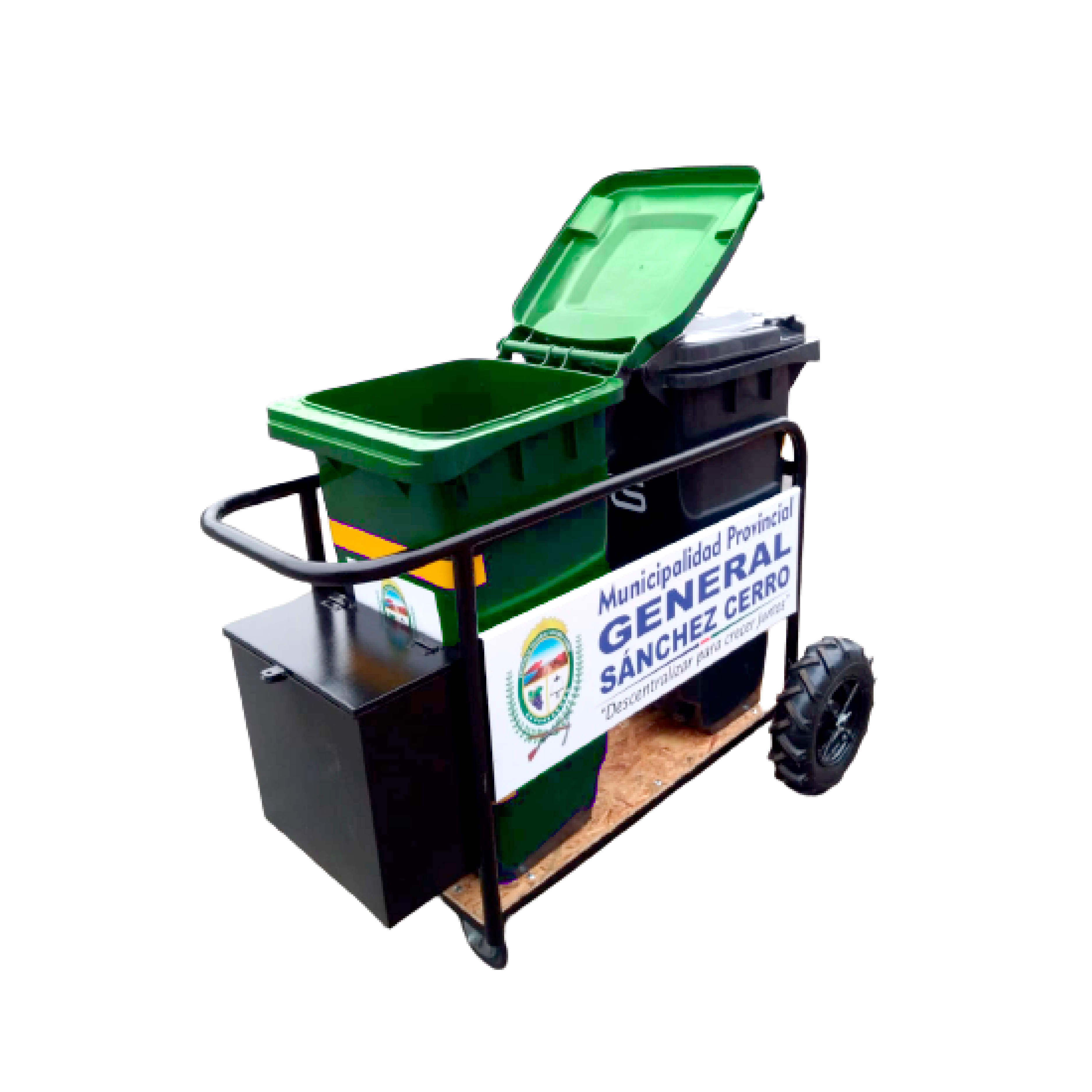 El coche de barrido con dos contenedores de 120 litros es una solución integral para la recolección, segregación y transporte de residuos sólidos durante las labores de limpieza urbana. Está diseñado para optimizar el trabajo del personal operativo en calles, parques, plazas, avenidas, mercados y espacios públicos, mejorando la eficiencia, seguridad y orden en la gestión de residuos. Los contenedores de 120 litros están fabricados en polietileno de alta densidad (PEAD) 100 % virgen, con aditivo anti UV, lo que garantiza alta resistencia a impactos, radiación solar y uso intensivo en exteriores. Todas las partes metálicas se encuentran galvanizadas, asegurando protección contra la corrosión y una mayor vida útil. El sistema de ruedas reforzadas facilita el desplazamiento incluso en superficies irregulares.