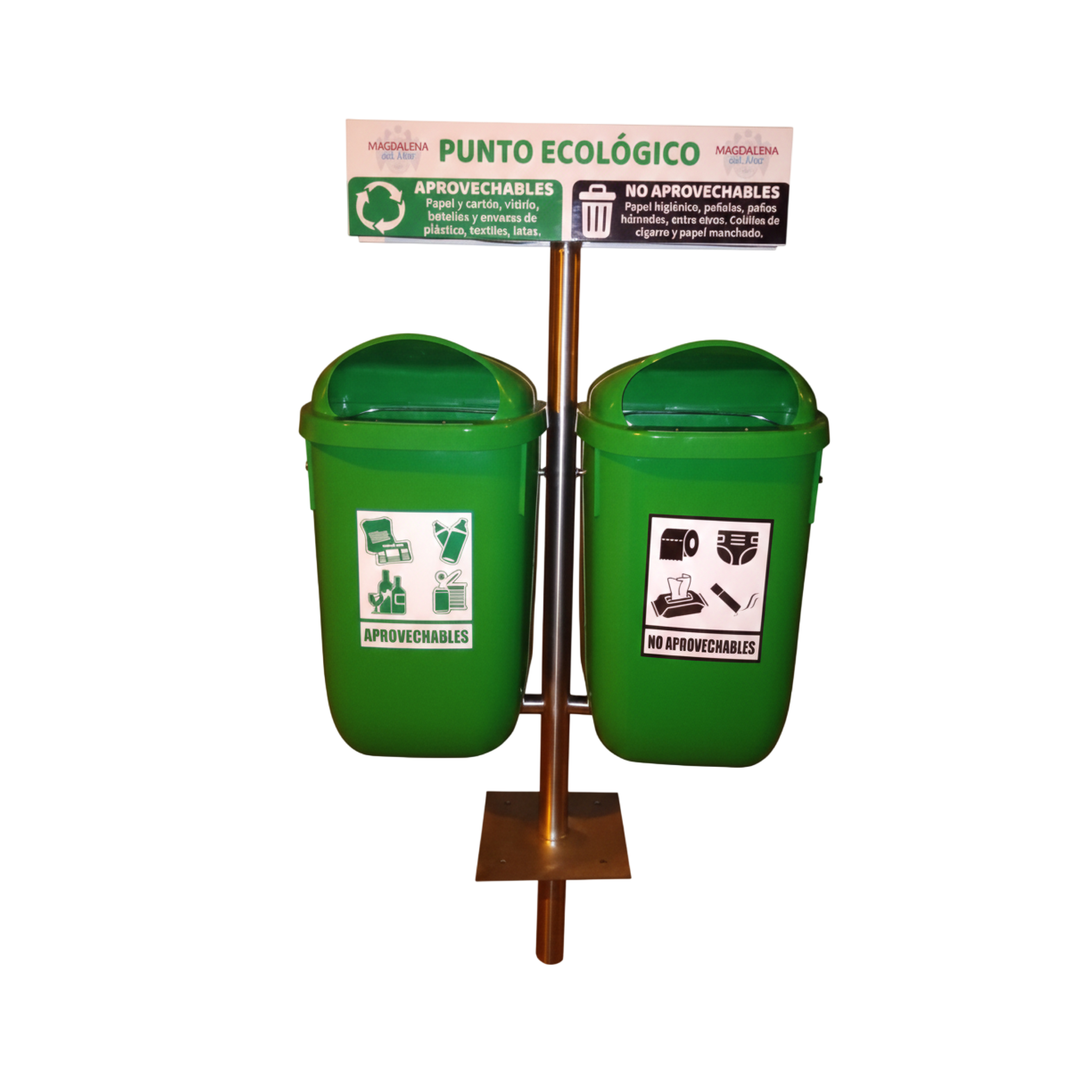 El conjunto incluye un panel de leyenda con vinil laminado personalizado en alta resolución, ideal para indicar claramente el tipo de residuo, reforzar campañas de educación ambiental y personalizar la estación con identidad institucional.