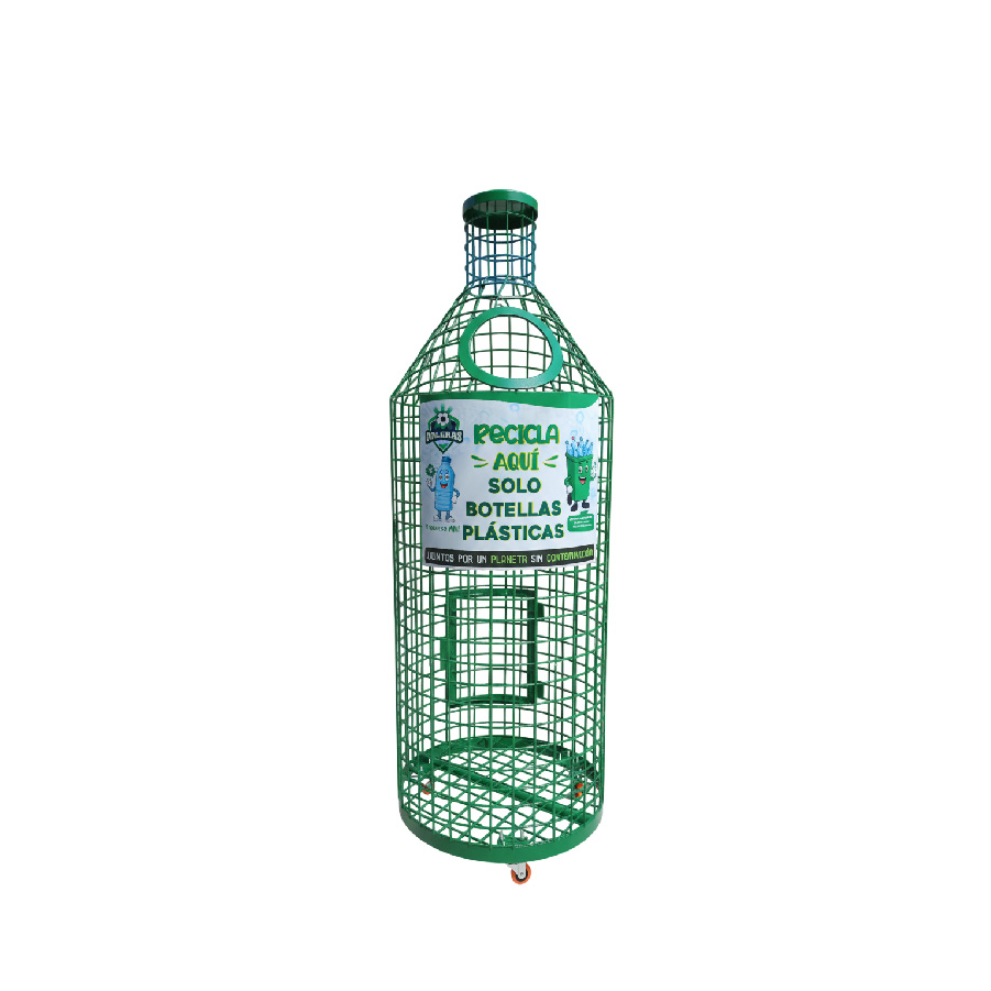 Botella de malla metálica diseñada para la correcta recolección de botellas plásticas PET, ideal para puntos ecológicos y programas de reciclaje en espacios públicos y privados. Su estructura resistente y sistema de movilidad facilitan un uso práctico y continuo.
