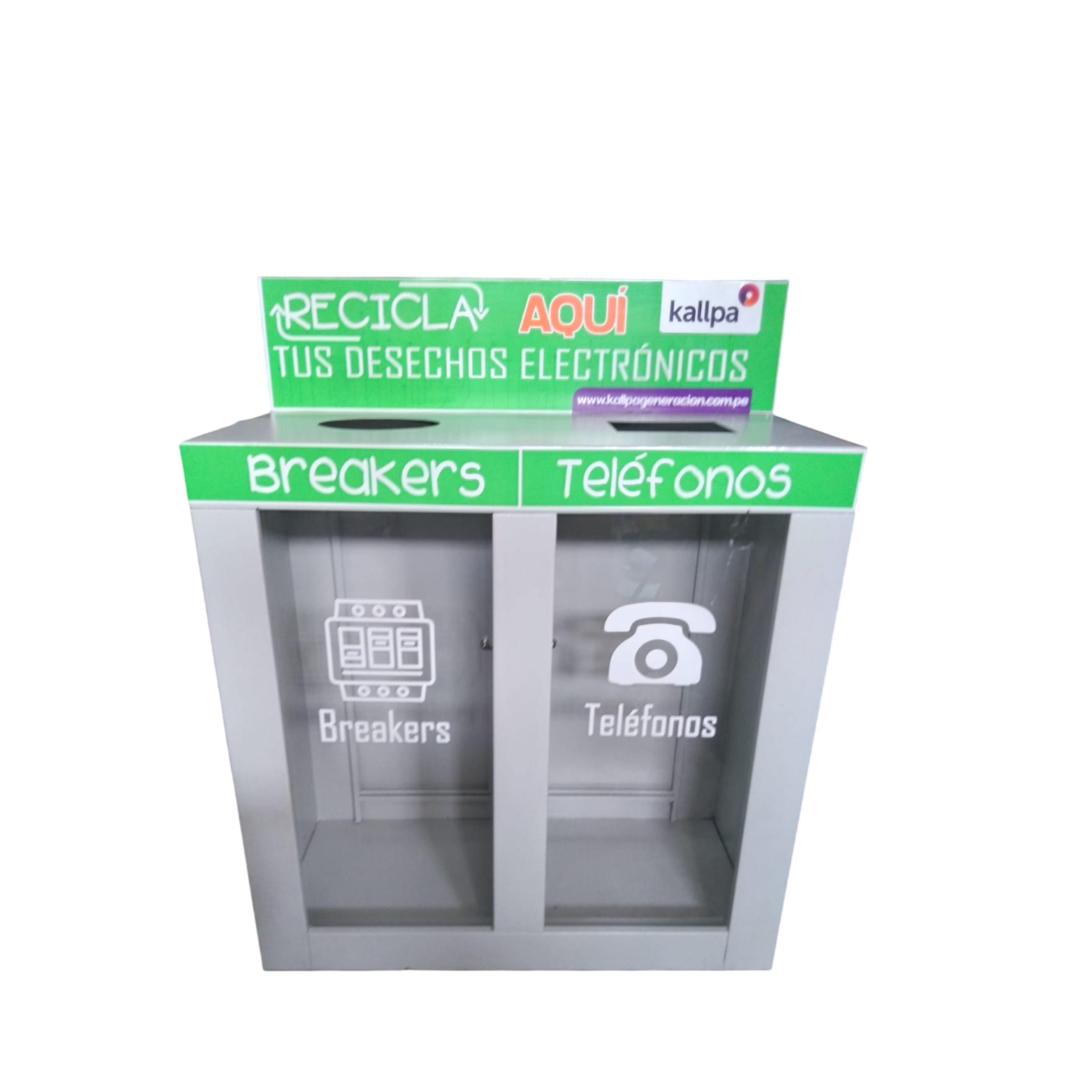 El contenedor para RAEE de 2 compartimentos está diseñado para la recolección, almacenamiento temporal y controlado de Residuos de Aparatos Eléctricos y Electrónicos (RAEE), tales como celulares, cables, cargadores, pequeños electrodomésticos y dispositivos electrónicos en desuso. Es ideal para instituciones educativas, empresas, oficinas, municipalidades y campañas de reciclaje tecnológico, donde se requiere una gestión segura y ordenada de este tipo de residuos especiales. Fabricado en estructura metálica de alta resistencia, el contenedor cuenta con un acabado de pintura en polvo electrostático al horno, que le otorga una excelente protección frente a la corrosión, el desgaste y el uso continuo en interiores o exteriores techados. Su acabado de alta calidad con tacto cuero brinda una presentación profesional, ideal para espacios institucionales.